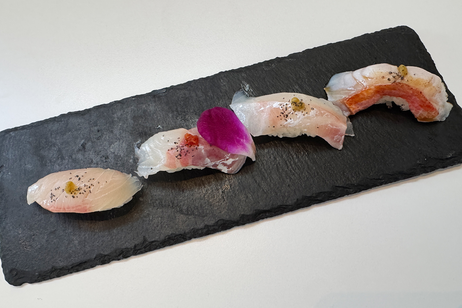 The first nigiri course contains four pieces of the chef’s choice. This differs between the days and the chef. During this dining experience, Seabream, Halibut, Golden Eye Snapper, and Shima Aji were served. Whitefish is absolutely delicious thanks to its sweeter, typically firm texture. I would prefer these over albacore and standard tuna cuts any day! The chefs made an effort to season the fish, so minimal soy sauce is needed.